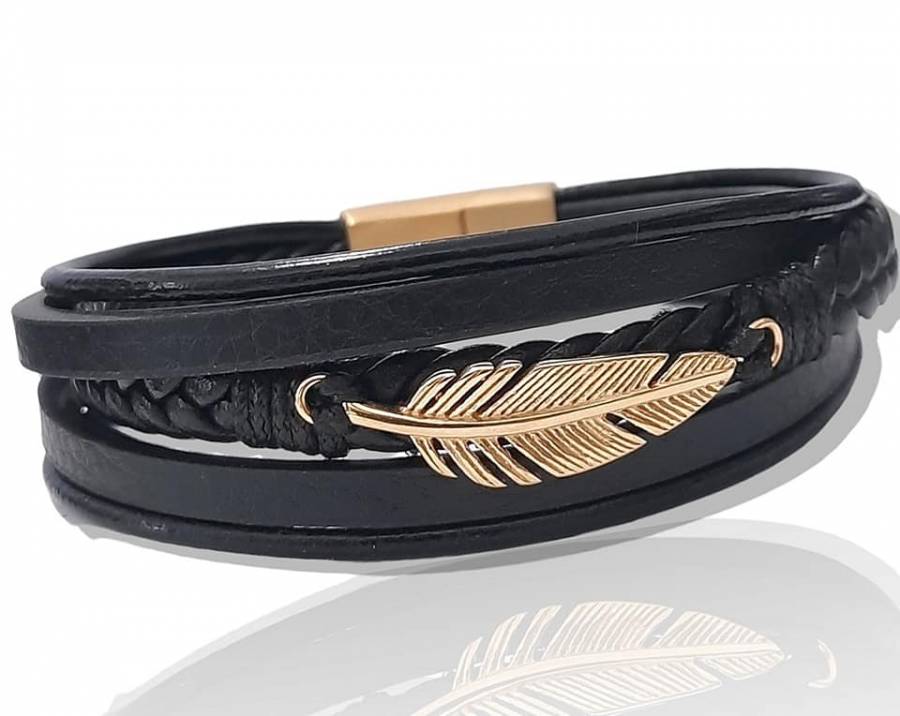 Eντυπωσιακό βραχιόλι με κοτσιδα , πλακε και στρογγυλά δέρματα . στοιχεία απο ανοξέιδωτο ατσάλι 316 L  σε σχέδιο φτερό , κ μαγνητικό κούμπωμα ασφαλείας ./