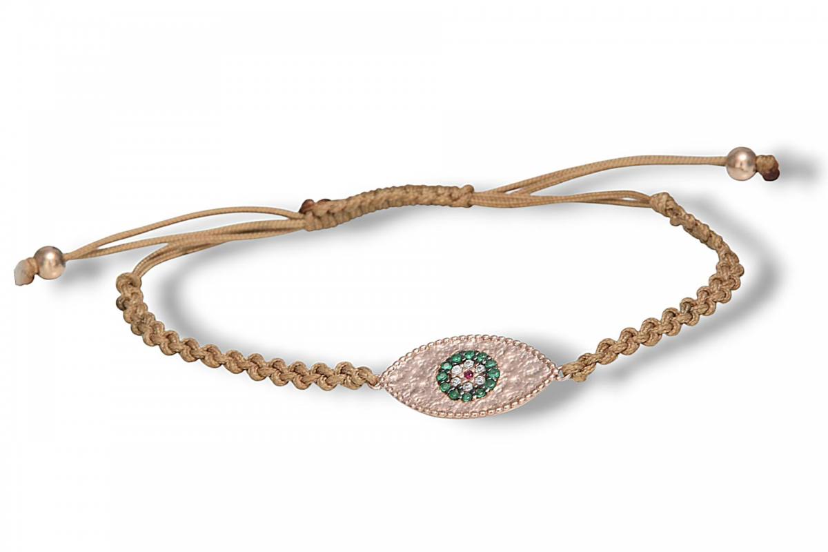 Xειροποίητο , και ξεχωριστό βραχιόλι με άψογο φινίρισμα , ασημένιο 925 και επιχρυσωμένο μάτι στα 14 κ ροζ χρυσό . σφυρήλατο με στόχο και ζιργκόν πέτρες  σμαραγδί,λευκές ,κόκκινη σε απόλυτη αρμονία .... κλέβει ματιές .....δέσιμο μακραμε εκρου .