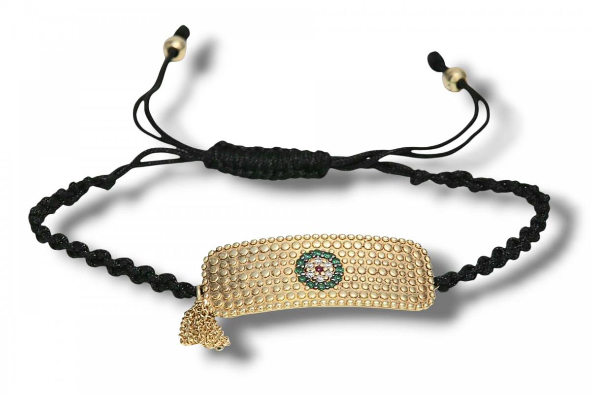 αψογο φινίρισμα , χειροποίητο βραχιόλι με αναγλυφη πλάκα , μάτι με σμαραγδί και λευκά ζιργκόν , κρεμαστά αλυσιδάκια . ενα ιδιαίτερο βραχιόλι με δέσιμο μακραμέ απο ασήμι 925 , επιχρυσωμένο κίτρινο χρυσό 18 Κ .