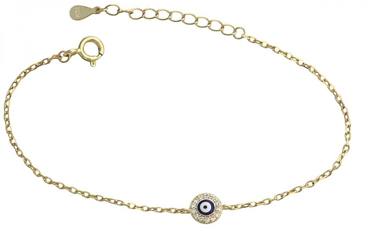 Διακριτικό και όμορφα φινιρισμένο βραχιόλι , απο ασήμι 925 . Επιχρυσωμένο 14 Κ κίτρινο χρυσό , με αίσθηση πολυτέλειας ματάκι στρογγυλό στοκέντρο με πέτρες ζιργκόν , και σμάλτο . ένα υπέροχο οικονομικό δώρο ......απο σήμι .!
