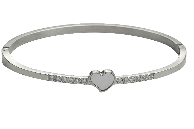 Μίνιμαλ άρτια φινιρισμένο γυναικείο βραχιόλι , απο ανοξείδωτο ατσάλι . Mε λουστράτες γυαλιστερές επιφάνειες , καρδιά με φίλντισι στο κέντρο και ζιργκόν πέτρες .!!! Πανέμορφο για ολες τις ώρες , μια υπέροχη πρόταση δώρου .... κι αφήστε το κόσμημα ...να μιλήσει .!