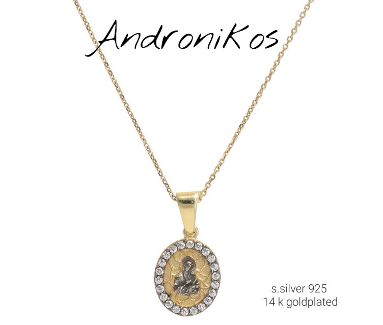 Μινιμαλ μικρό πένταντ όμορφα φινιρισμένο με ανάγλυφη επιφάνεια , Παναγίτσα οξειδωμένη , και ζιργκόν καρφωτά περιμετρικά . αλυσίδα 40 εκατοσ΄τα μήκος . απο ασήμι 925 επιχρυσωμένο κολιέ 14κ κίτρινο χρυσό .