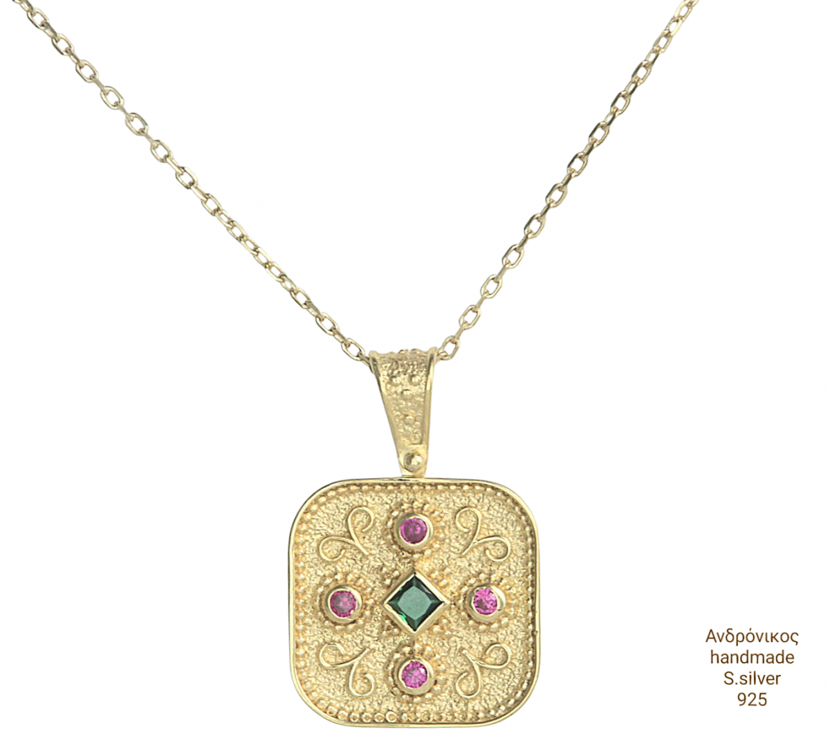 Μέ άριστουργηματικό φινίρισμά , λοιπόν με έμφαση στη λεπτομέρεια , με ντουμπλέ επιχρυσωση στα 18 καρατια κίτρινο χρυσό , σκαλισ΄το με ζιργκόν καρφωτά , ένα εκλπηκτικό κολιέ με Βυζαντινό πένταντ απο ασήμι 925 .! ...