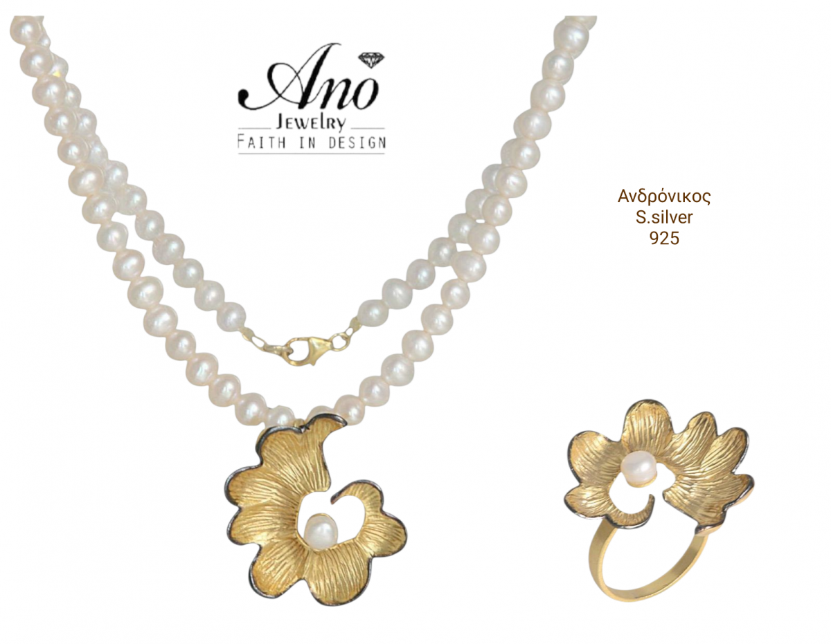 Μοναδικής έμπνευσης σέτ , μαργαριταρένιο κολιέ , και δαχτυλίδι απο τη συλλογή Αno * .Εκπλεπτυσμένη κομψότητα σε τέλεια αρμονία μαργαριτάρι και χειροποίητο ενθετο απο ασήμι 925 , επιχρυσωμένο στα 18 καράτια κίτρινο χρυσό , με διακριτική λεπτομέρεια στα χείλη μαυρο ρόδιο . Συνοδέυεται με το δαχτυλίδι του.