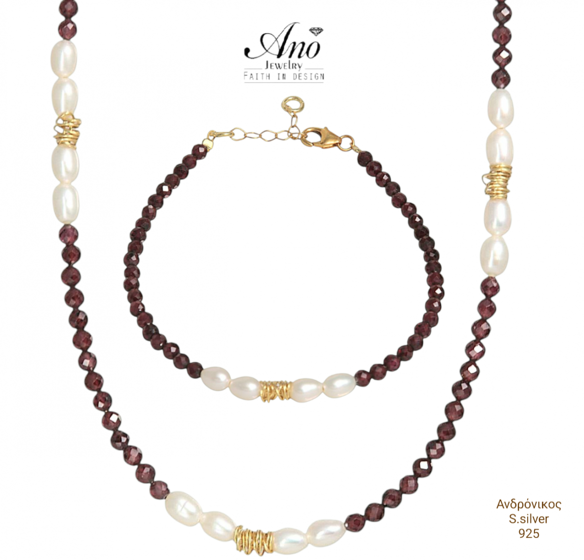 •  Kολιέ και βραχιόλι απο τη συλλογή Αno * Mε ημιπολύτιμες πέτρες γρανάδα , σε τέλεια αρμονία με μαργαριτάρια και στοιχεία ασημένια , επιχρυσωμένα με κιτρινο χρυσό 18 καρατίων .