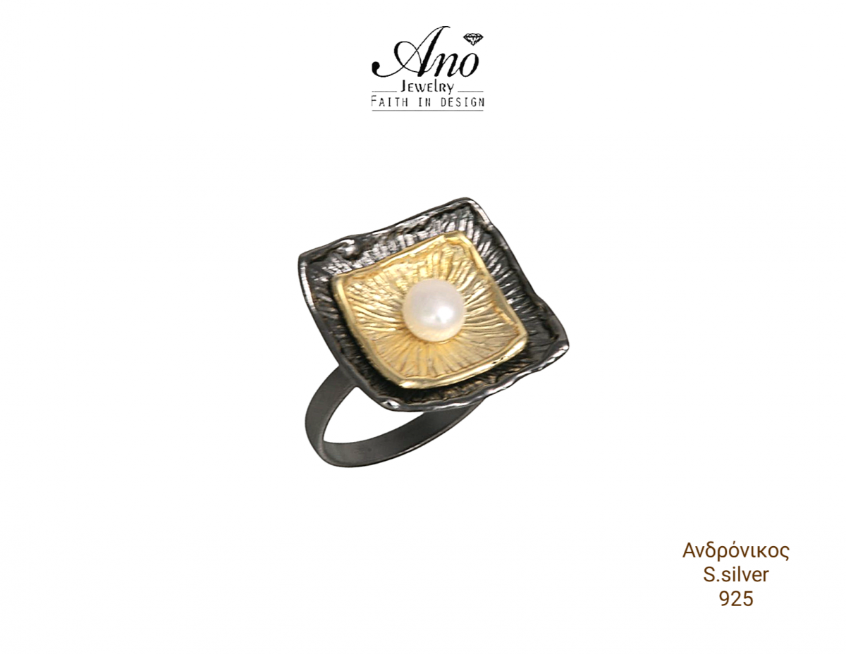 Γυναικείο χειροποίητο δαχτυλίδι απο τη συλλογή Ano * Mαυρο ρόδιο , χρυσωμα ντουμπλέ στα 18 καράτια κίτρινο χρυσό και μαργαριτάρι .! ένα μοναδικής εμπνευσης κόσμημα απο ασήμι 925 με ανάγλυφες επιφάνειες , με ιδιαίτερο μοναδικό στύλ και χαραχτήρα για εσάς που εντυπωσιάζετε σε κάθε σας εμφάνιση .!