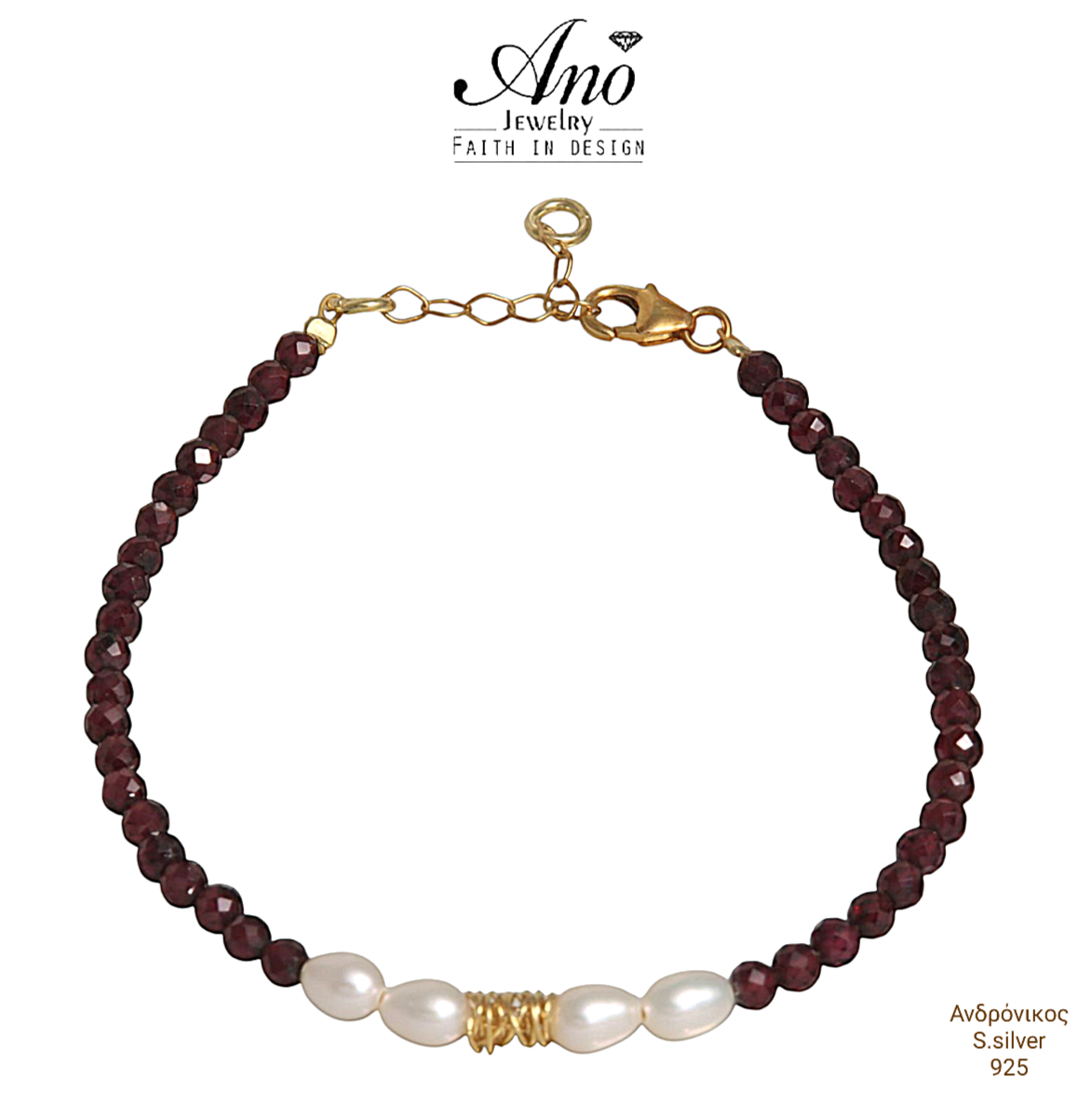 Xειροποίητο βραχιόλι απο τη συλλογή Αno * με γρανάδες μαργαριτάρια και στοιχεία α΄πο ασήμι 925 χρυσωμένα στα 18 καράτια κίτρινο χρυσό , ντουμπλέ .