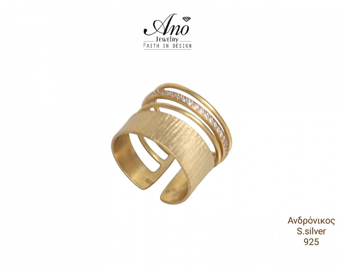 Χειροποίητο δαχτυλίδι απο τη συλλογή Αno * Mε ανάγλυφες επιφάνειες χρυσωμένες στα 18 καράτια κίτρινο χρυσό , λουστράτες βέργες και σειρέ με ζιργκόν καρφωτά . Ανοιγόμενη ρυθμιζόμενη +  - 1 No