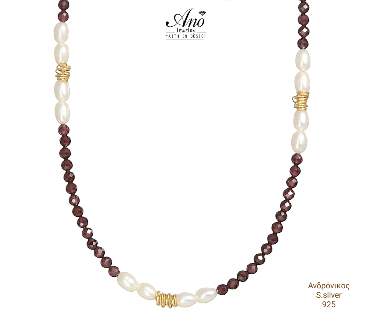 Χειροποίητο κολιέ από τη συλλογή Ano * Mε ημιπολύτιμε΄ς πέτρες γρανάδα , &  μαργαριτάρια  , σε ΄τέλεια αρμονία με στοιχεία απο ασήμι 925 , χρυσωμένα στα 18 καράτια κίτρινο χρυσό . Μία υπέροχη πρόταση για ξεχωριστές εμφανίσεις με μοναδικό στύλ και ...ποιότητα .!