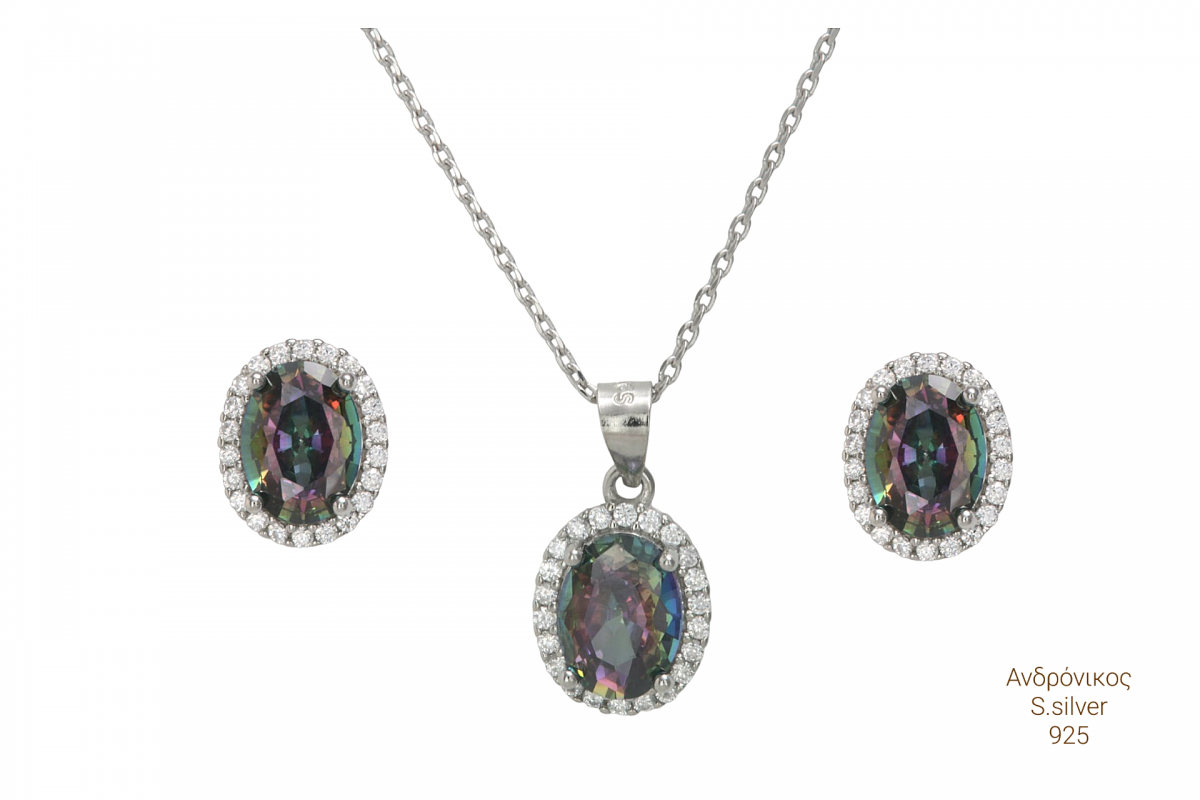 Από ασήμι 925 , επιπλατινωμένο σετ σκουλαρικια και κολιέ , σε σχέδιο ροζέτες , με ολοκαινουριο ζιργκόν ιριδίζον . μοναδικές και ιδιαίτερες αποχρώσεις σε κάθε κίνηση .
