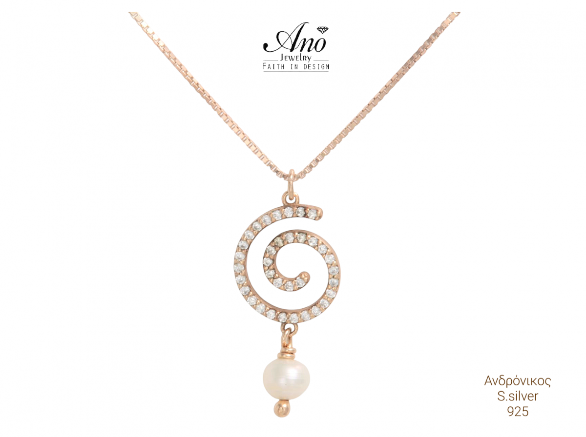 Γυναικείο κολιέ απο τη συλλογή Ano *  Από ασήμι 925 με ζιργκόν πέτρες σε σχέδιο σπείρα , επιχρυσωμση 14 Κ ροζ χρυσό , και κρεμαστό μαργαριτάρι .
