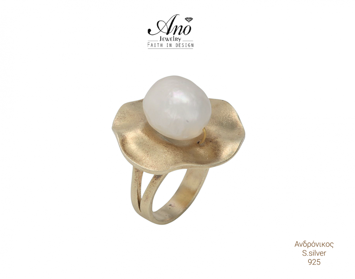Γυναικείο δαχτυλίδι απο τη συλλογή Αno * Αμμοβολισμένο με μάτ επιφάνεια και μεγάλο μαργαριτάρι κέντρο , απο ασήμι 925 και χρύσωμα 18 κ κίτρινο χρυσό . Μια πρόταση για όλες τις ώρες για ξεχωριστές εμφανίσεις και μοναδικό στύλ με χαραχτήρα.