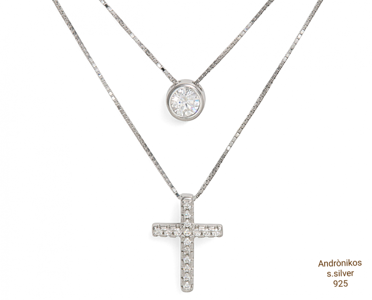 •  Διπλό ασημένιο κολιέ ασήμι 925 επιπλατινωμένο , με σειρέ μικρό Σταυρο καιμονοπετρο καστόνι .