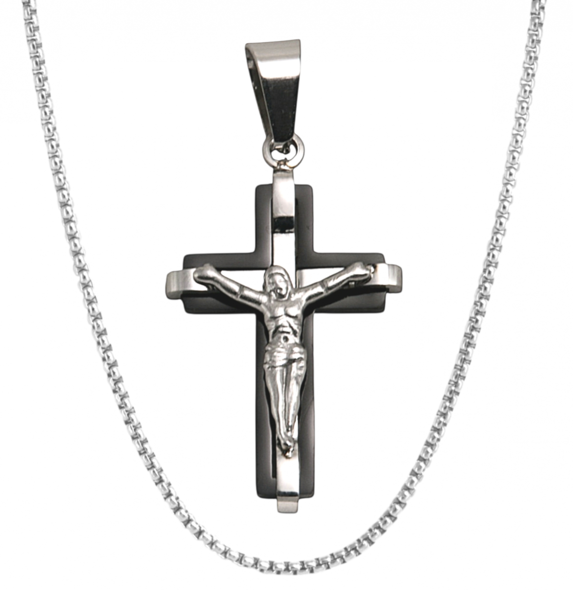 Σέτ Σταυρός και αλυσίδα ανοξείδωτο ατσάλι 316 L . ιδανικό για καθημερινή χρήση , δε προκαλει αλεργίες και δε χανει τη λάμψη του ακόμη και στις ποιό αντίξοες συνθηκες . Μέ αριστο φινίρισμα και αίσθηση πολυτέλειας ανάγλυφος Σταυρός με παράσταση Εσταυρωμένο , σε διχρωμία ασημί μαυρο και διαστάσεις  3.2 χ 2 εκατοστά  με μέτρηση χωρίς το κρίκο ..