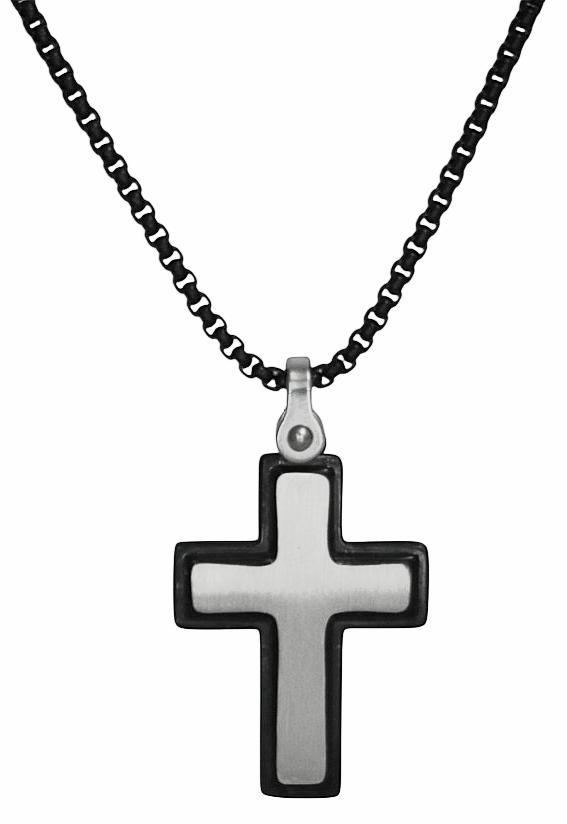 Ανδρικός Σταυρός ατσάλι 316 L . δίχρωμος Σταυρός με σατινέ ασημί επιφάνεια μάτ , και μαύρες λεπτομέρειες , ιδανικός για καθημερινη χρήση η δώρο .! μοντέρνος με μαύρη αλυσίδα 55 εκατοστά + 5 προέκταση , και διαστάσεις 2.7 χ 2 εκατοστά , χωρίς το κρίκο .