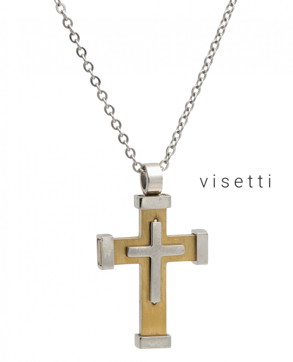 Ανδρικός Σταυρός από τη συλλογή visetti . Aνοξείδωτο ατσάλι 316 L σατινέ ματ επιχρυση επιφάνεια και λουστράτες γυαλλιστερές λεπτομέρειες . ιδανικός για δώρο η καθημερινή χρήση , διατηρεί τη λάμψη του και το φινίρισμά του ακόμη και στις ποιο αντίξοες συνθηκες , Συνοδευεται με διακριτική ατσάλινη αλυσίδα που κουμπωνει 55 αλλα και 60 εκατοστά . Προσφέρεται με συσκευασία δώρου visetti .