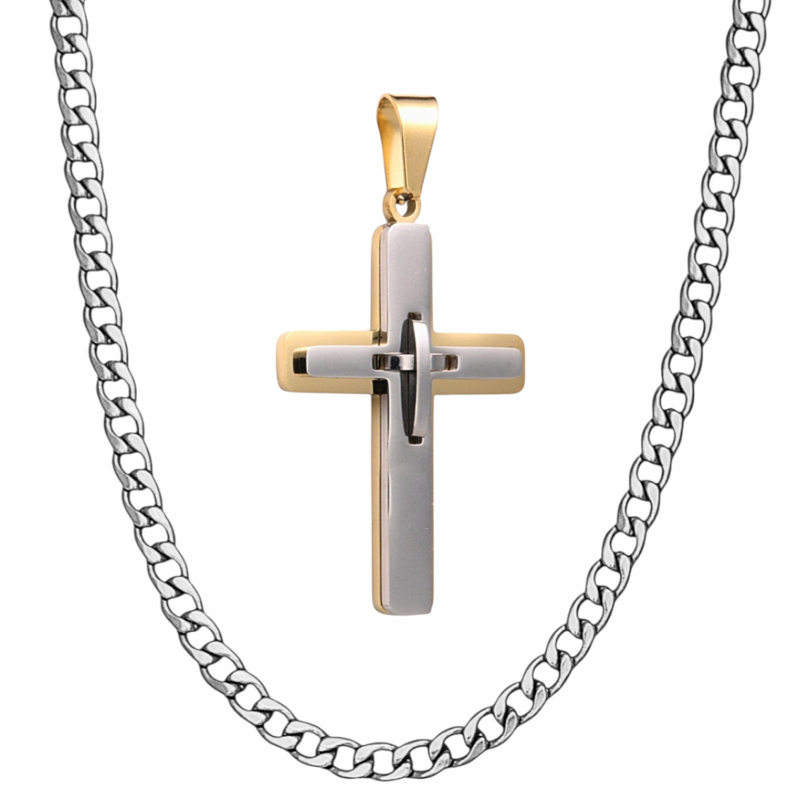 Ενας άριστα φινιρισμένος Σταυρός σε διχρωμία ασημί χρυσό . Για καθημερινή χρηση και ιδανικός για το τέλειο δώρο απο ατσάλι 316 L , διατηρεί τη φινέτσα του και την υφή του ακόμη και στις ποιο δύσκολες συνθήκες νερο θάλασσα ιδρωτα .. Με διαστάσεις 4 εκατοστά ύψος , χωρίς το κρίκο , και 2,6 εκατοστά πλάτος με δυναμικό στύλ και χαραχτήρα , συνοδευεται με γκουρμέτ αλυσίδα 60 εκατοστά μήκος και 3,7 mm πλάτος .....Ανδρικός Σταυρός , εντυπωσιακός σε διχρωμία ασημί - χρυσό . με γυαλιστερές επιφάνειες λουστράτες , όμορφα φινιρισμένος απο ανοξείδωτο ατσάλι . συνοδευεται με ατσάλινη αλυσίδα γκουρμέτ με  πλάτος 3. ΜΜ .!!! 55 CM / ( 50 / 60 CM ) .Ο Σταυρός μας έχει ύψος 4 εκατοστά χωρίς το κρίκο κ πλάτος 2.6 εκατοστά . Σταυρός κ αλυσίδα ανοξείδωτο ατσάλι 316 L . ενα υπέροχο ανδρικό δώρο , η μια επιλογή για εσάς που θα σας συντροφευεει όλες τις ωρες .