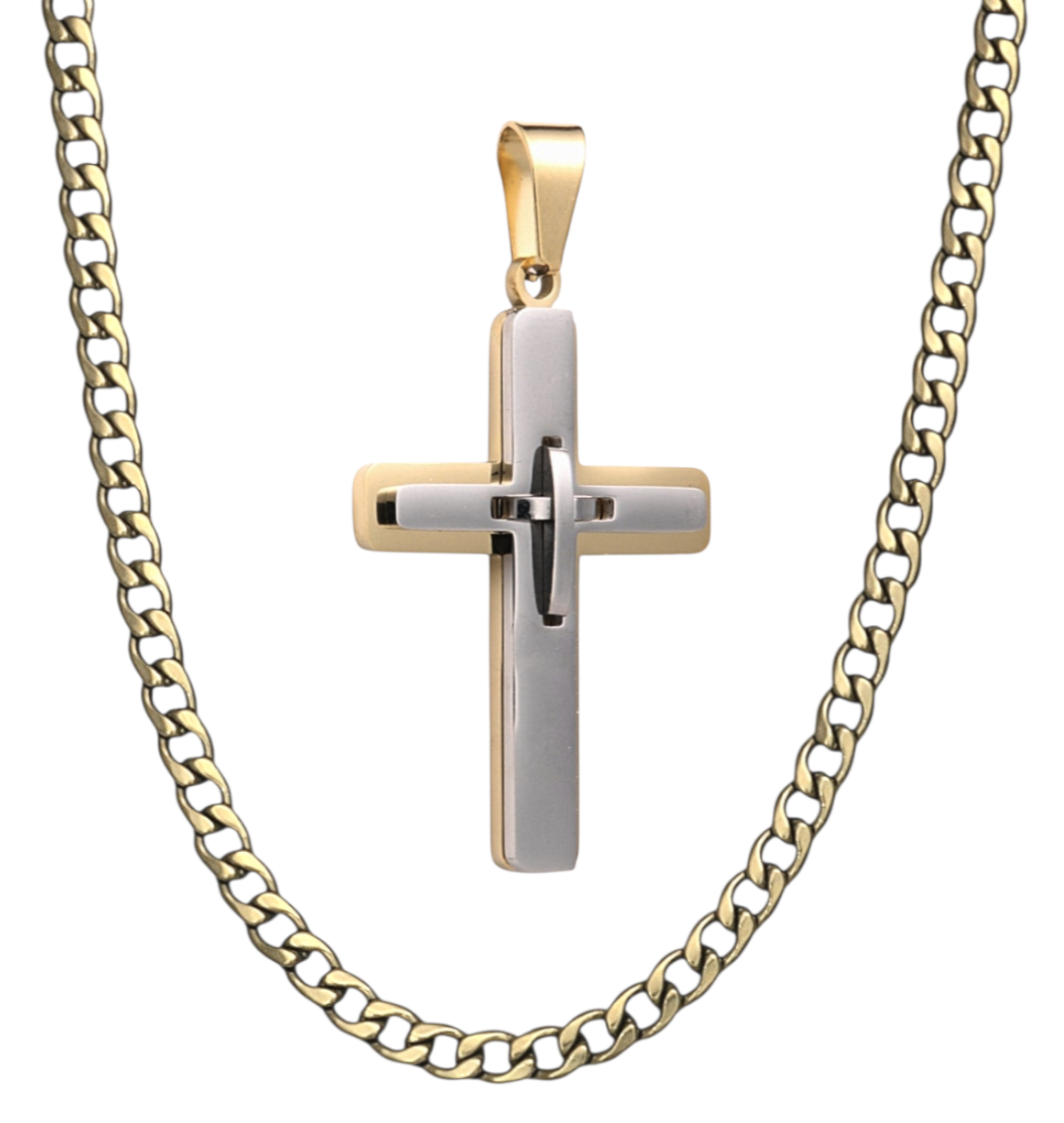 Eξαιρετική σχεδίαση άψογο φινίρισμα δίχρωμος Σταυρός ανδρικός ανοξείδωτο ατσάλι 316 L . διατηρεί τη φινετσα του τη λάμψη του ιδανικός για το τέλειο δώρο .! με 4 εκατοστά ύψος χωρίς το κρίκο και 2,6 εκατοστά πλάτος , έχει το τρόπο να στρεψει τα βλέματα σε καθε σας κίνηση .!διχρωμία ασημί χρυσό , και αλυσίδα επιχρυση γκουρμέτ 60 εκτοστά μήκος και 3,7 mm πλατος . *Excellent design, impeccable finish, two-tone men's cross, stainless steel 316 L. It maintains its elegance and shine, ideal for the perfect gift.! With 4 centimeters in height without the ring and 2.6 centimeters in width, it has the way to turn heads on your every move.! Two-tone silver gold, and a gold-plated gourmet chain 60 centimeters long and 3.7 mm wide.