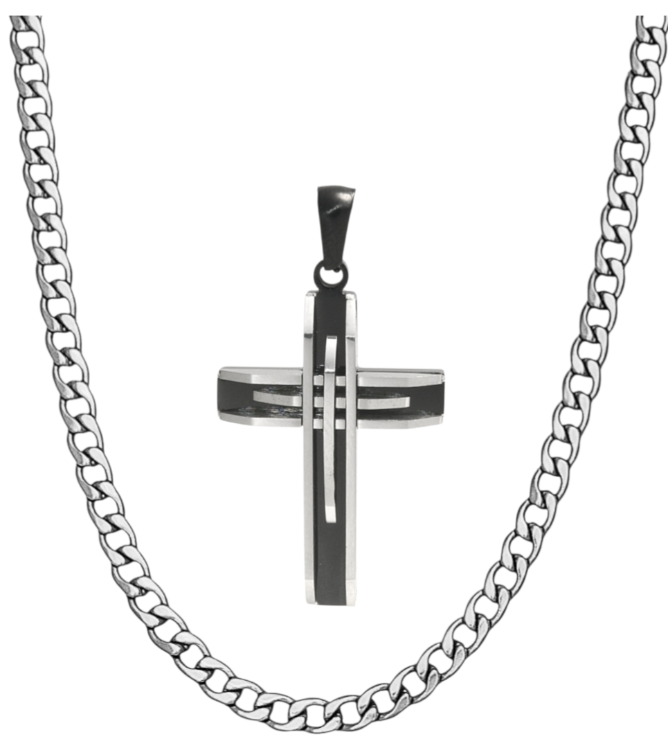 Ανδρικος Σταυρός με άριστο φινίρισμα , σε διχρωμία ασημί μαύρο ! Από ανοξείδωτο ατσάλι 316 L διατηρει τη λάμψη του ακόμη και στίς ποιο αντίξοες συνθήκες ! Ιδανικό για δώρο , για καθημερινή χρήση η ... ιδιαίτερες περιστάσεις . Ειναι σεταρισμένος με γκουρμέτ αλυσίδα 60 cm /  3.7 mm ( 0.37 cm ) πλάτος , ενώ διαθέσιμη ειναι κ  55 εκατοστά μήκος .