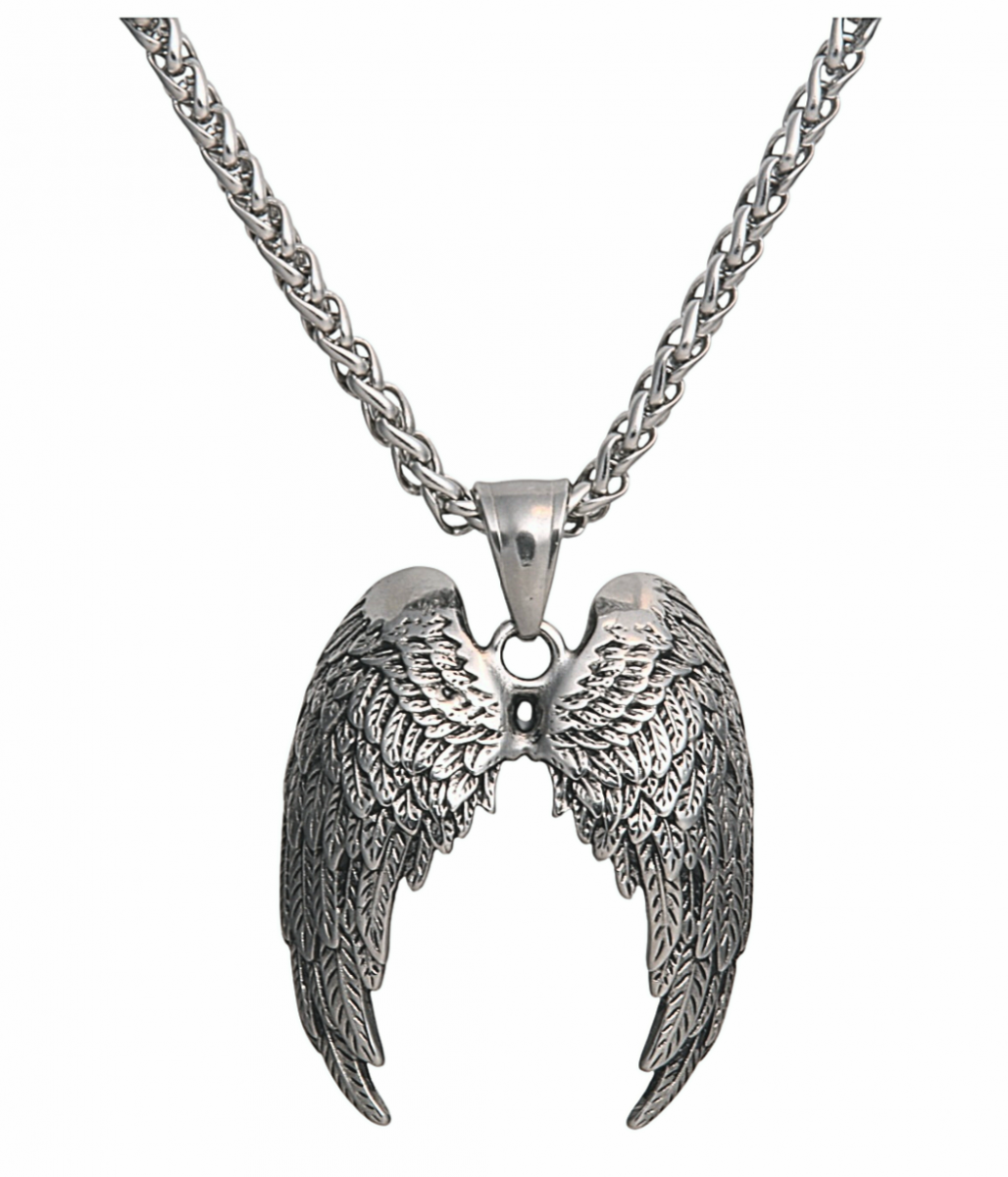 Ανδρικό κολιέ από ανοξείδωτο ατσάλι με μενταγιόν φτερά αγγέλου, σύμβολο προστασίας και ελευθερίας.